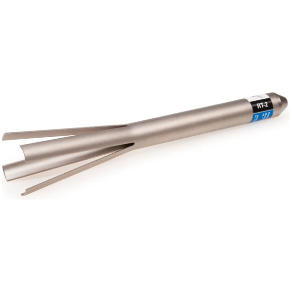 Инструмент Park Tool RT-2 для снятия рулевых чашек. Инструмент вытягивается через раму до тех пор, пока закручивающиеся концы не защёлкнутся за чашкой. Удар по головке инструмента удаляет чашку.