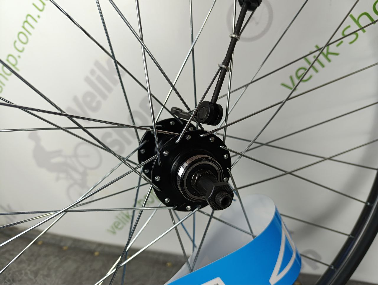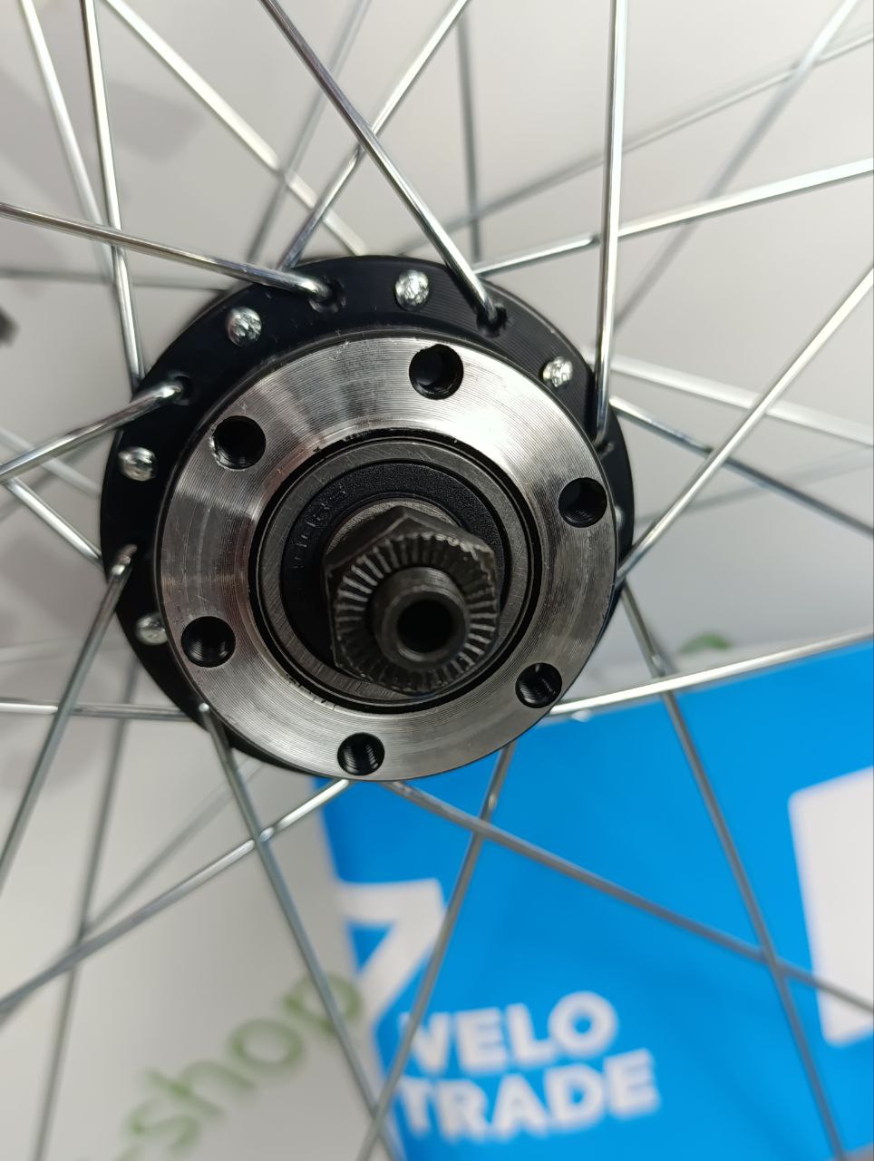 Колесо велосипедное заднее. Собрано на двустенном алюминиевом ободе производства компании Velotrade. Предназначено для устнановки на велосипеды с дисковыми тормозами. Профиль обода не имеет плоской поверхности и не может быть использован на велосипедах с вибрейками.