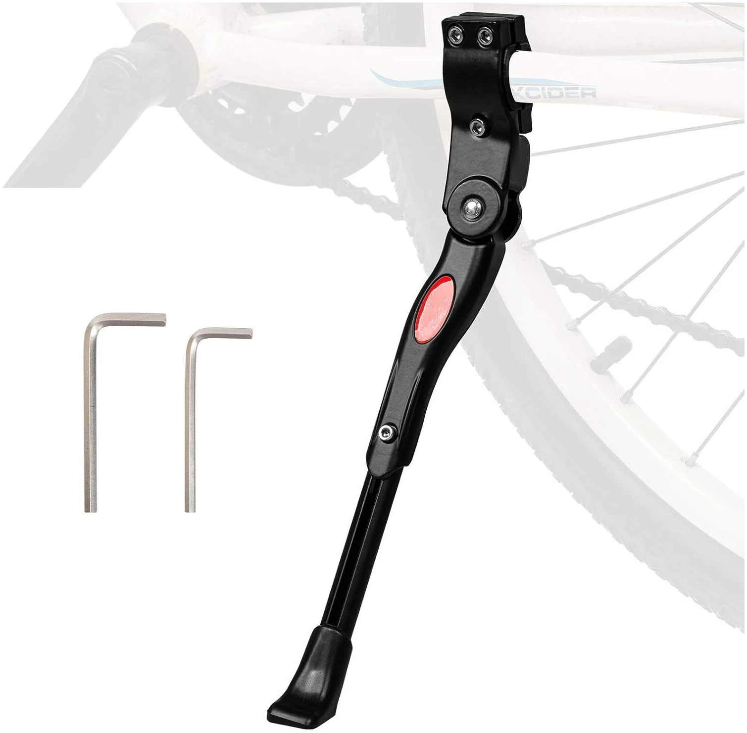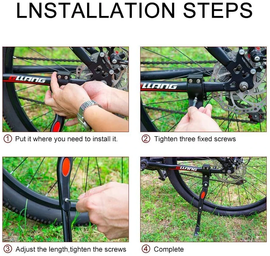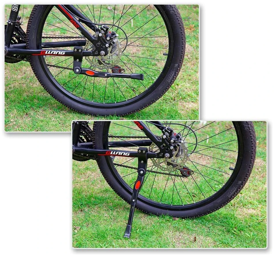 Телескопическая выдвижная система из алюминия, высота фиксируется винтом под шестигранник. Диапазон регулировки по размеру колеса велосипеда от 24″ до 29″. В сложенном виде подножка не болтается, не создает постороннего шума от скачков и вибрации благодаря мощной пружине. Крепление к нижнему перу рамы в любом месте, с помощью хомута с пластиковыми втулками.