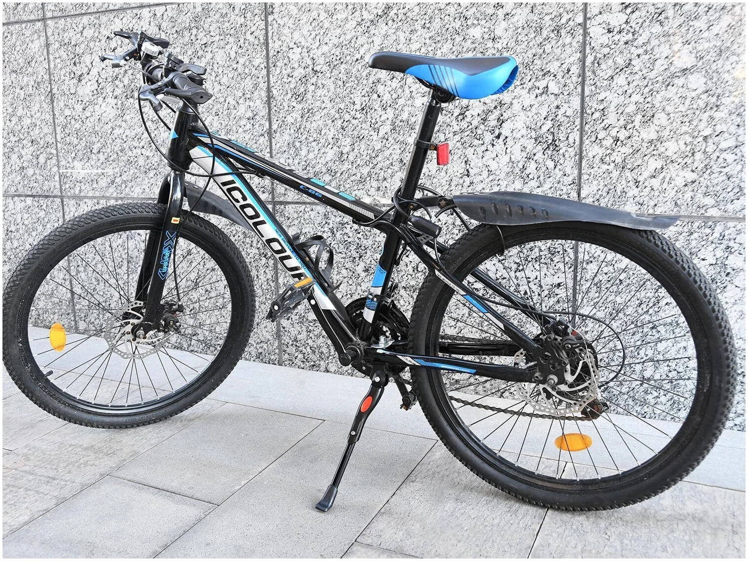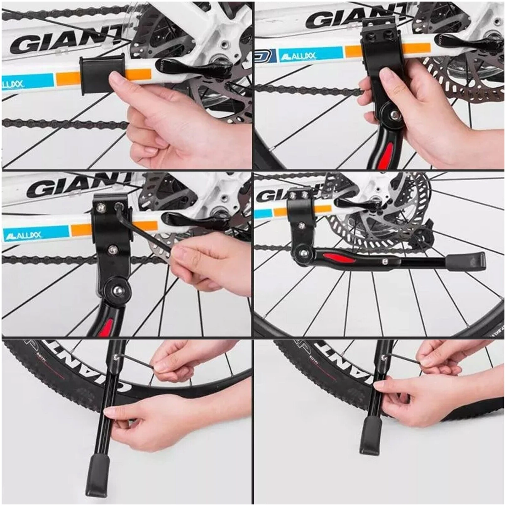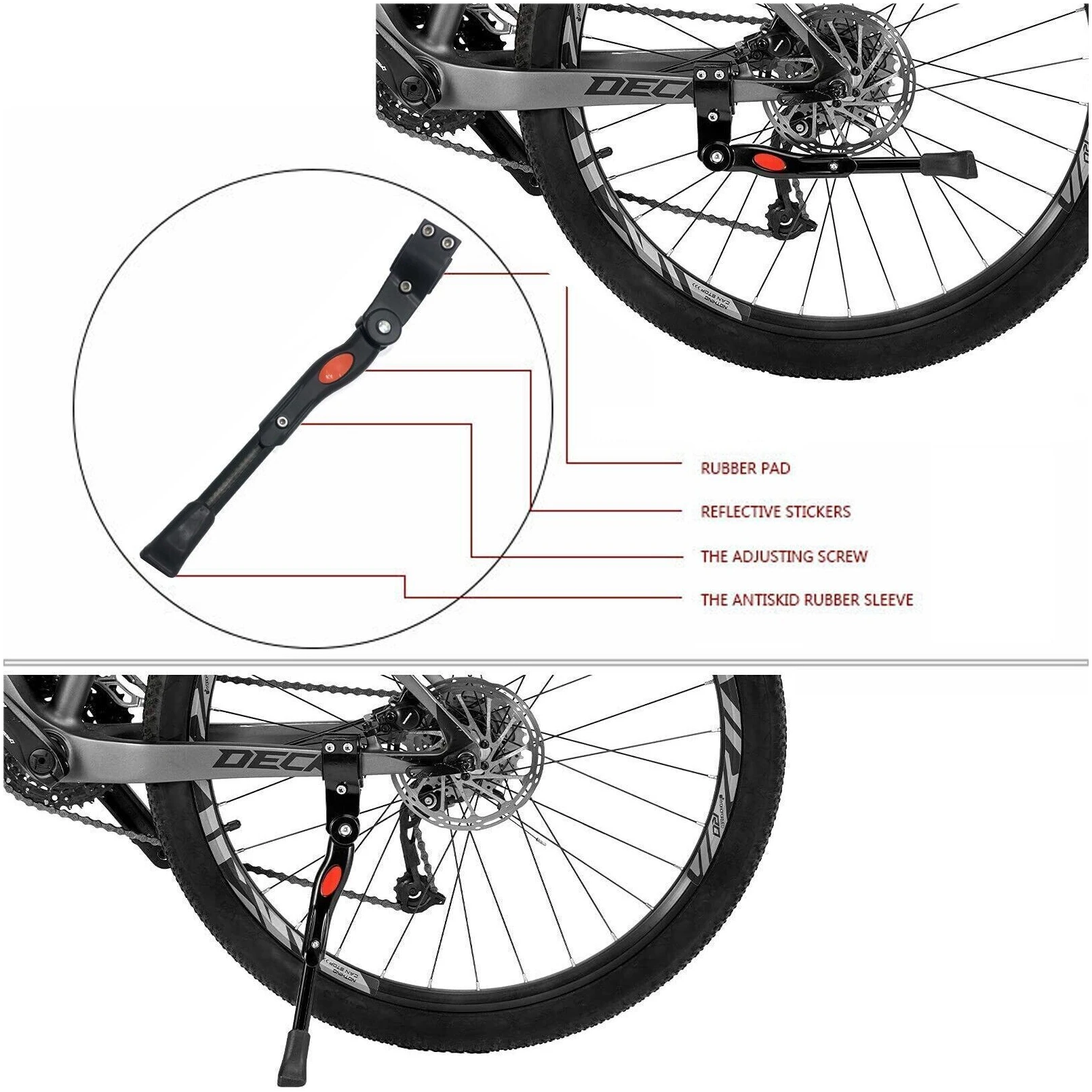 Телескопическая выдвижная система из алюминия, высота фиксируется винтом под шестигранник. Диапазон регулировки по размеру колеса велосипеда от 24″ до 29″. В сложенном виде подножка не болтается, не создает постороннего шума от скачков и вибрации благодаря мощной пружине. Крепление к нижнему перу рамы в любом месте, с помощью хомута с пластиковыми втулками.