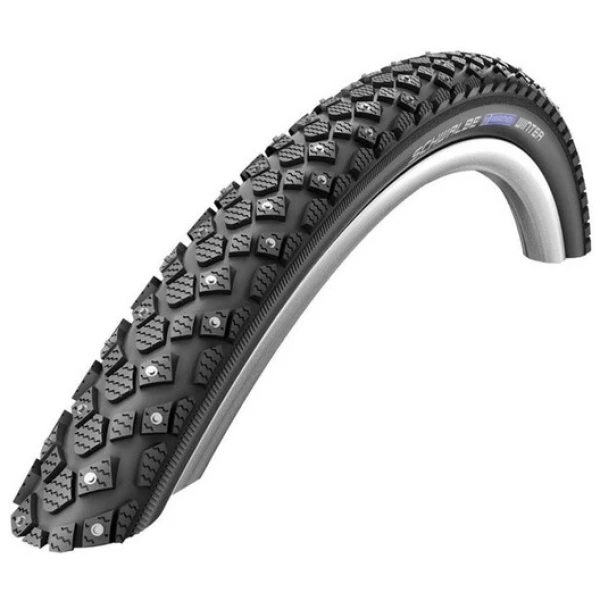Покрышка Schwalbe MARATHON WINTER предназначена для безопасных поездок зимой. При сниженном давлении воздуха шипы хорошо удерживают велосипед на обледенелых дорогах, а при максимальном — обеспечивают отличное качение с минимальным шумом.
