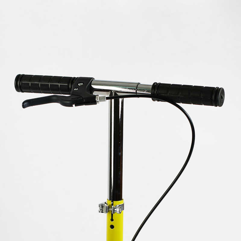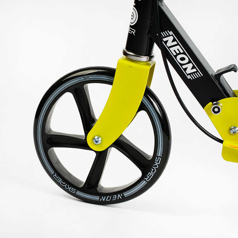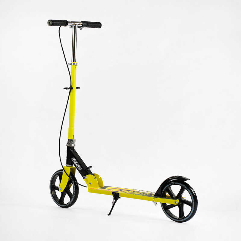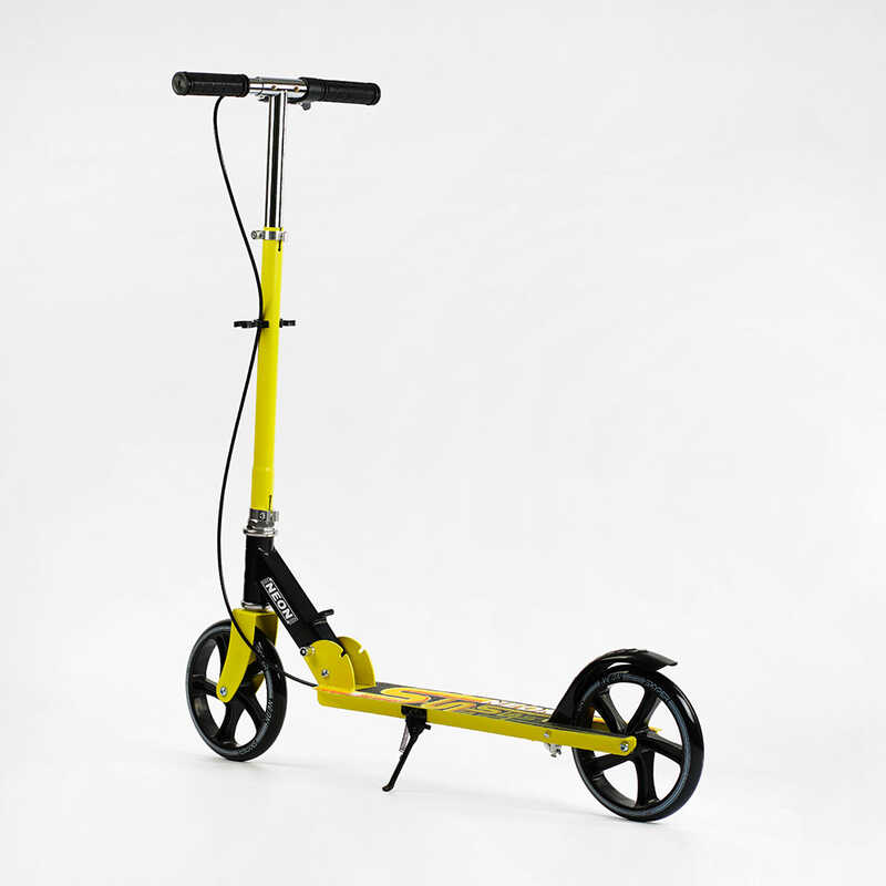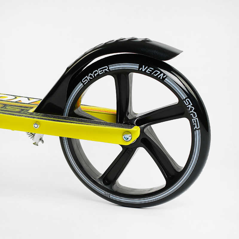 – Стальное ножное тормозное колесо- Ручной тормоз с правой стороны- Резиновые грипсы- Пластиковые диски колёс- Складная конструкция- Наклейка на деке – наждак