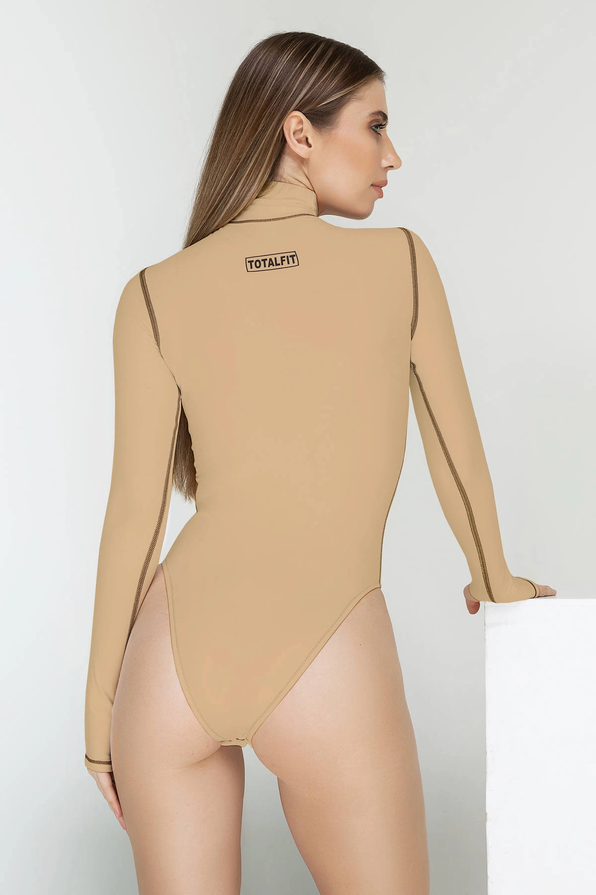 Покрой изделия имеет хорошую посадку, благодаря чему не будет приносить дискомфорт. Длинный рукав с фиксацией на пальчике. Высокое горло. Рельефная кокетка, именно этот рельеф выгодно подчеркнет грудь. Также по всему боди можно увидеть рельефные швы, они формируют облегающий силуэт, обеспечивают идеальную посадку изделия по фигуре, деликатно повторяют естественные изгибы тела. Застежка внизу на кнопках в два ряда.