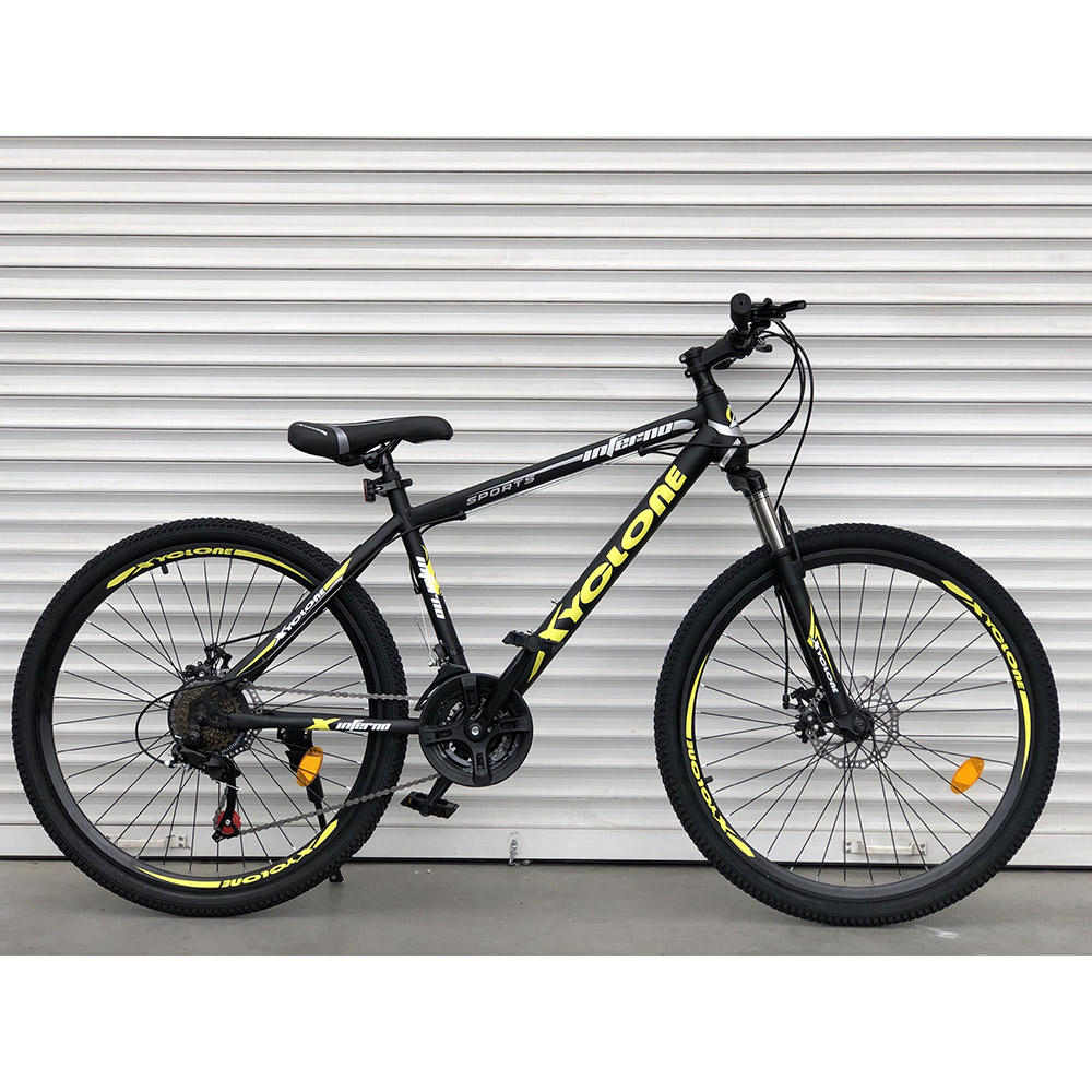 Горный велосипед оснащен точечными переключателями скоростей и двойным ободом колес, что делает транспортное средство более прочным и устойчивым от повреждений во время езды по неровностям.