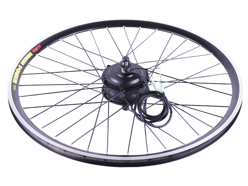 Елементи готові до монтажу. Встановлюються легко і без проблем з посадковими місцями та тріскачками. Зібране та закріплене колесо з електродвигуном 36v 350w, ставиться на передню або задню вісь велосипеда (залежно від комплекту). Міцний обід з посиленими спицями захищає двигун від деформації, витривалий і стійкий до навантажень.