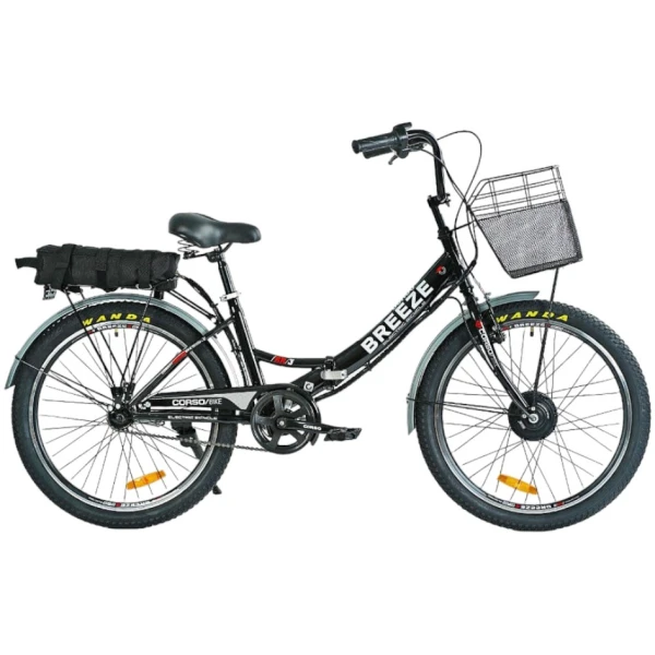 Потужний редукторний двигун на 350 Вт/36 Вольт, передній привід, ручка газу, складана конструкція, PAS система, переднє гальмо V-brake, заднє – ножне, міцний багажник, залізний кошик, залізні крила, м’яке сидіння |