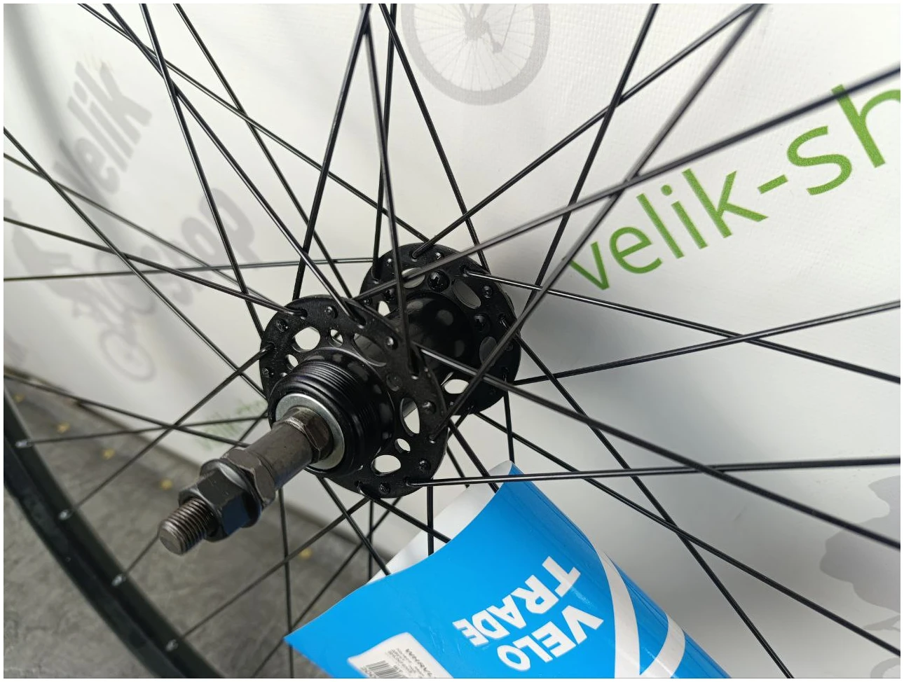 Колесо велосипедне заднє. Зібрано на двостінному алюмінієвому ободі виробництва компанії Velotrade. Призначено для встановки на велосипеди з дисковими гальмами. Профіль обода не має плоскої поверхні і не може бути використаний на велосипедах з вібрейками.