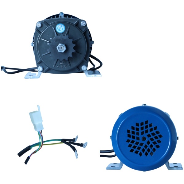 QS BM1418ZXF — компактний редукторний двигун для електровелосипедів, самокатів, карта та трициклів із ланцюговим приводом. Живлення 48 В, потужність 500 Вт, холостий хід близько 480 об/хв. Має вихідну зірочку й монтажні лапи; довжина кабелю ≈1100 мм для зручного прокладання.