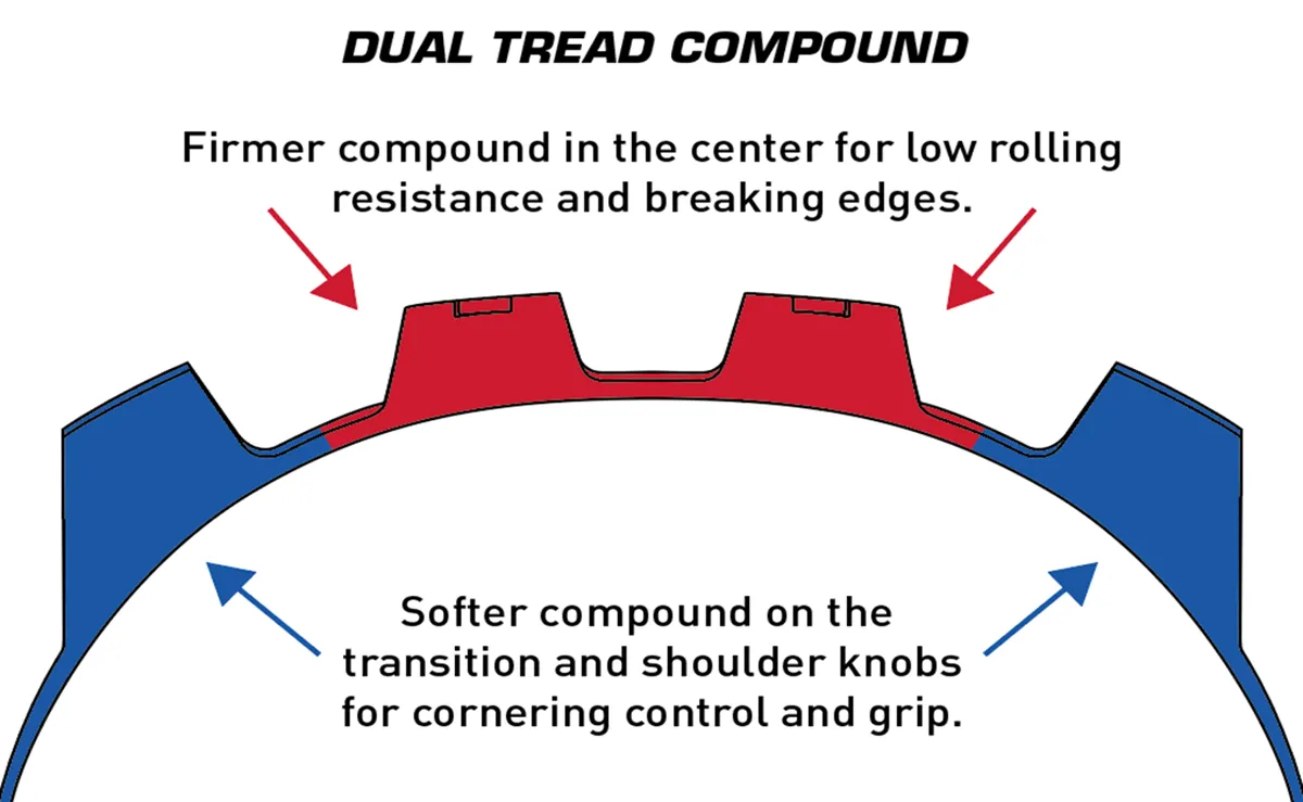 Покришка завдяки технології з двох з’єднань гуми Dual Compound: твердий, міцніший центр і м’які сторони, отримала чудове поєднання легкої ваги, зносостійкості та не високої ціни.
