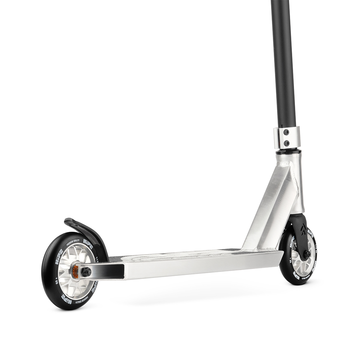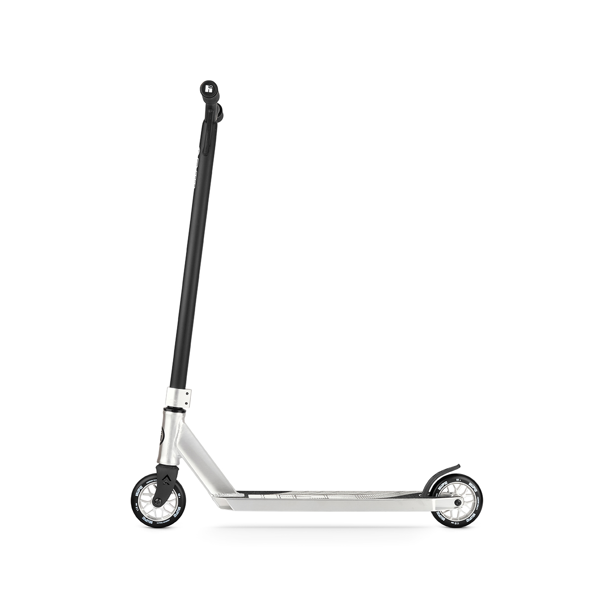 Міцні спицеві алюмінієві колеса діаметром в 110 мм і жорсткістю в 88А гарантують підвищений накат, дозволяючи розвивати більш високу швидкість. На 110 мм, на відміну від 100 мм, складніше повертати, але зберігати пряму при їзді значно легше. Ці переваги роблять самокат відмінним для застосування в стріті.